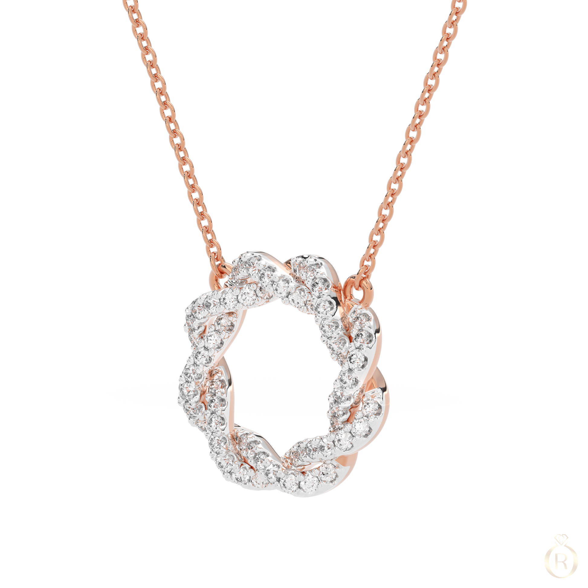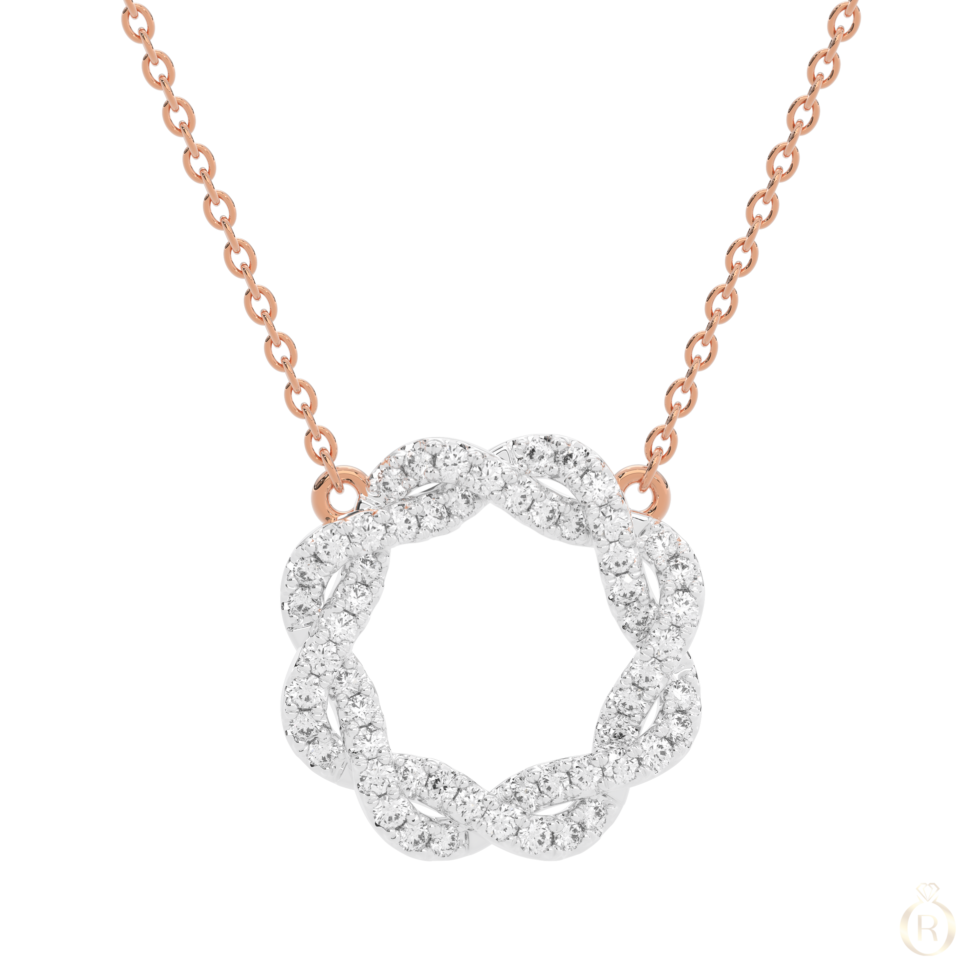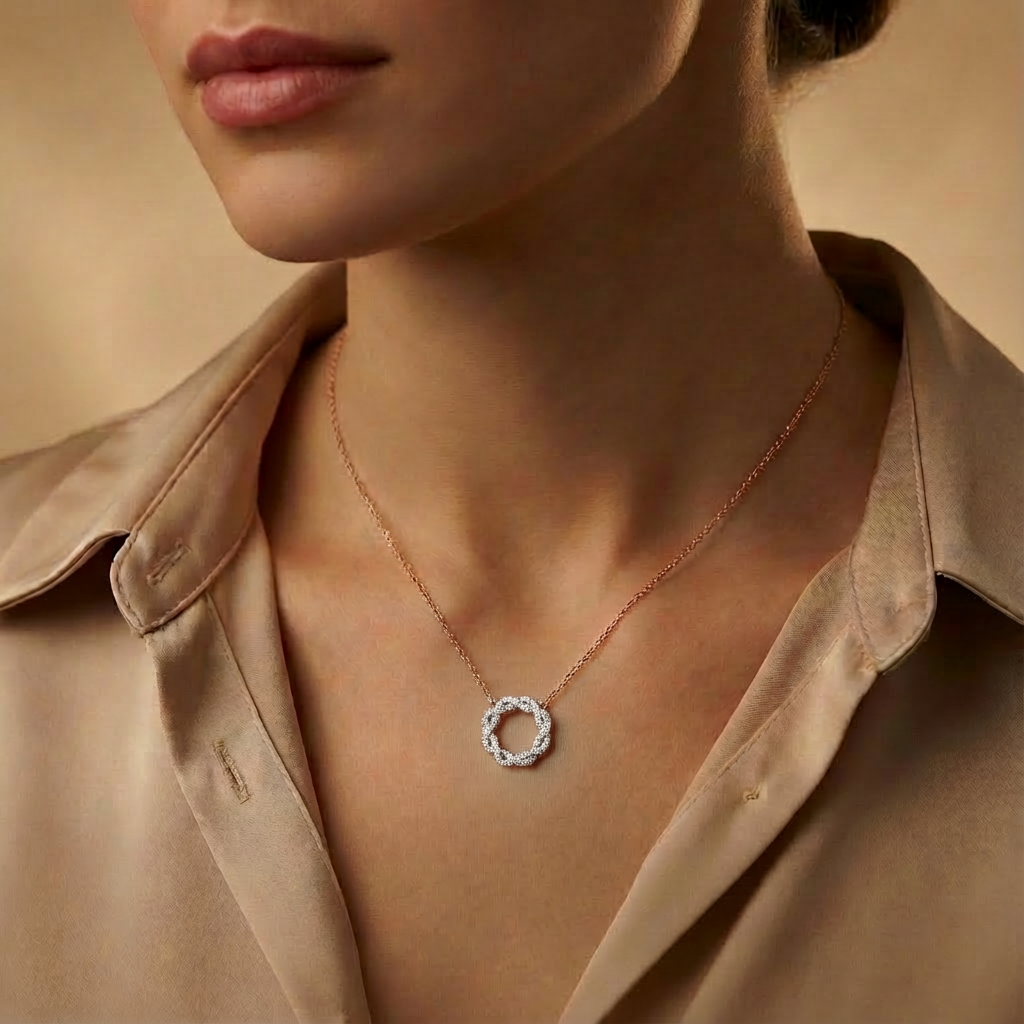 Rosé Galaxie Blanche - in bezaubernder Anhänger in Kreisform aus 18 Karat Roségold, durchzogen von funkelnden Diamanten wie eine weiße Galaxie am Nachthimmel, Die 40 sorgfältig gefassten Steine reflektieren das Licht mit himmlischer Eleganz, Vollendet mit einer feinen Ankerkette mit Federringverschluss – ein Hauch von Kosmos für dein Dekolleté.
