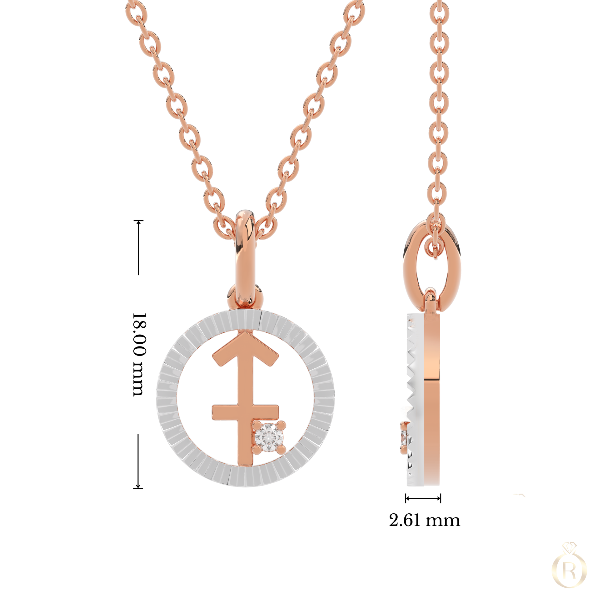 Ein Zeichen aus den Sternen: Der Anhänger Rosé Signe Astral Schütze aus 18 Karat Roségold trägt das fein gravierte Symbol des Schützen, ergänzt durch einen brillant geschliffenen Diamanten, Ein Schmuckstück für optimistische, weltoffene Persönlichkeiten mit Lust auf Abenteuer und Freiheit — perfekt für alle, die das Leben mit Schwung und Lebensfreude genießen,