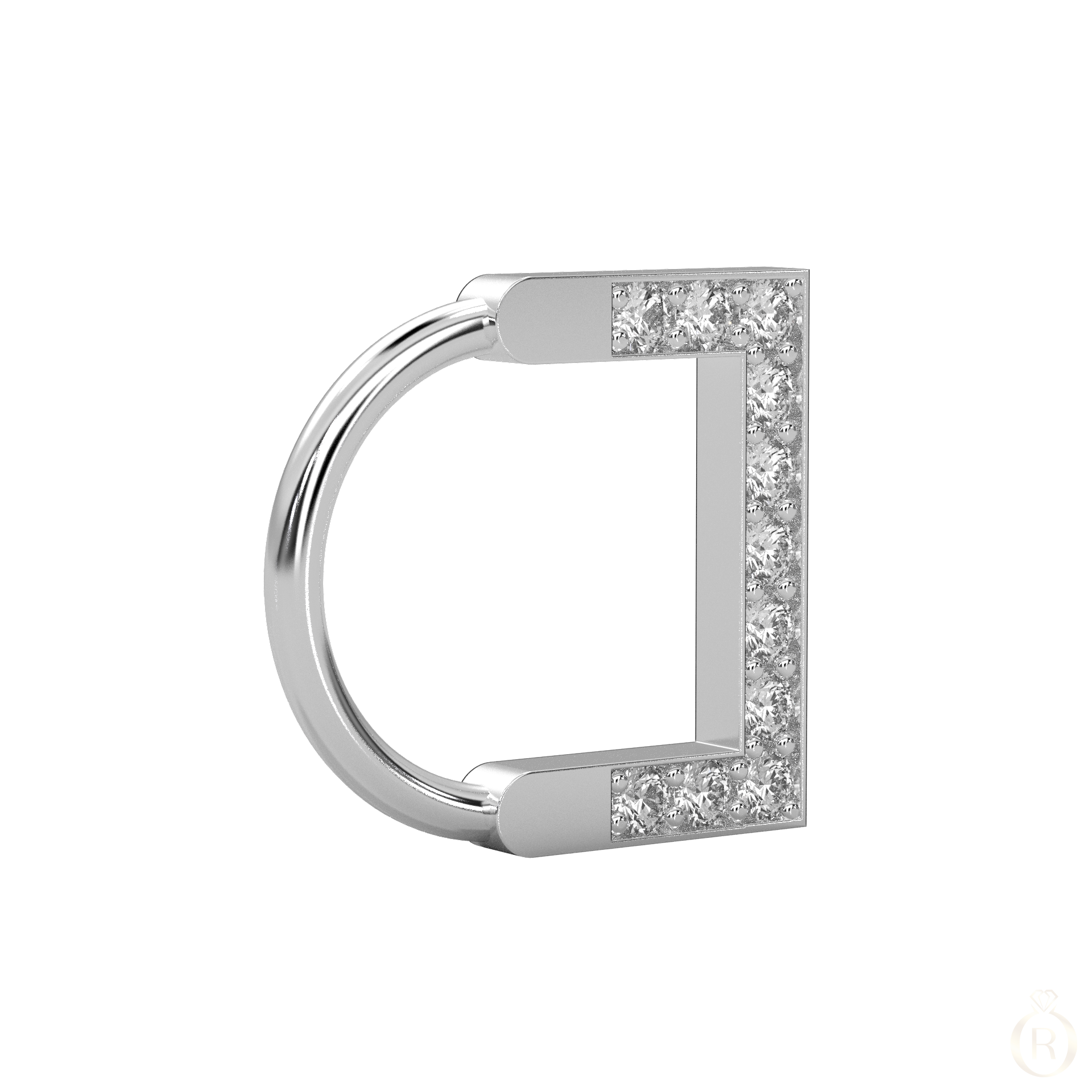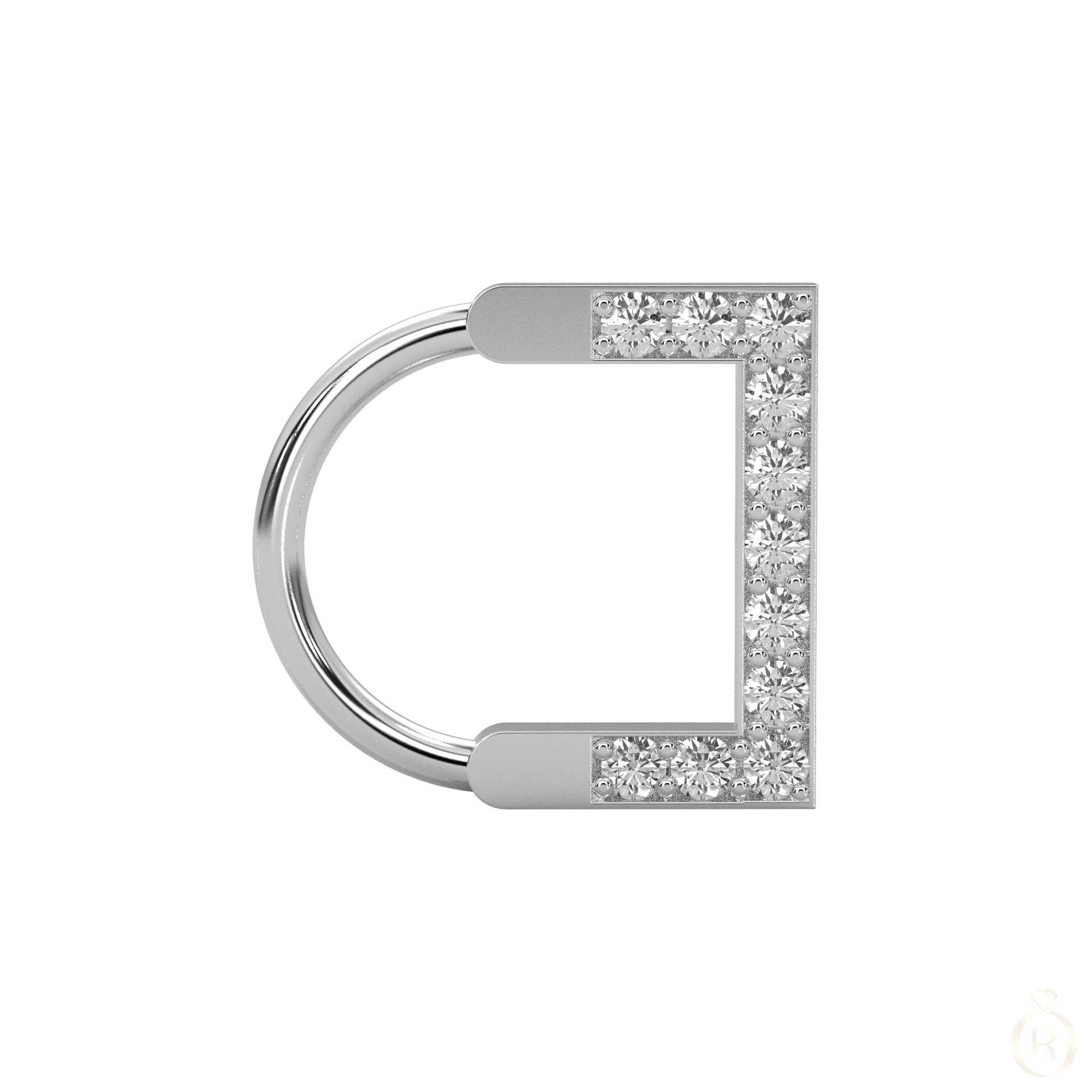 Rosé Cornice is a finely crafted single piercing earring in 18 karat white gold, adorned with brilliant-cut diamonds. Its angular silhouette is reminiscent of a fine frame – clean, graphic, and subtly elegant. Worn alone, it highlights the design’s geometry with a hint of refined radiance.
